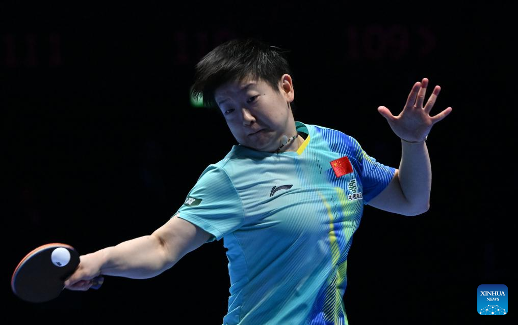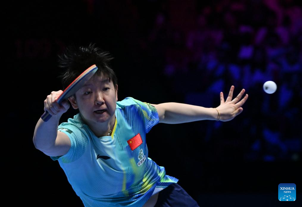 South Korea's Shin Yubin hits a return during the women's singles group 10 match between Shin Yubin of South Korea and Linda Bergstrom of Sweden at the ITTF Men's and Women's World Cup 2026 in Macao, China, March 30, 2026. (Xinhua/Cheong Kam Ka)