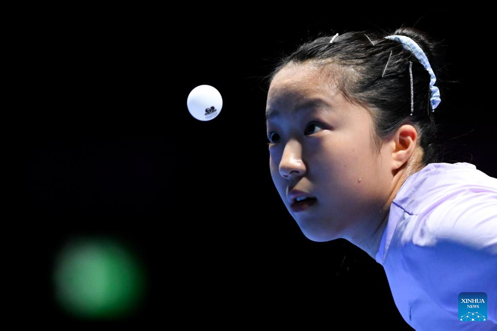 Chen Xingtong competes during the women's singles group 3 match between Chen Xingtong of China and Andreea Dragoman of Sweden at the ITTF Men's and Women's World Cup 2026 in Macao, China, March 30, 2026. (Xinhua/Yu Yang)