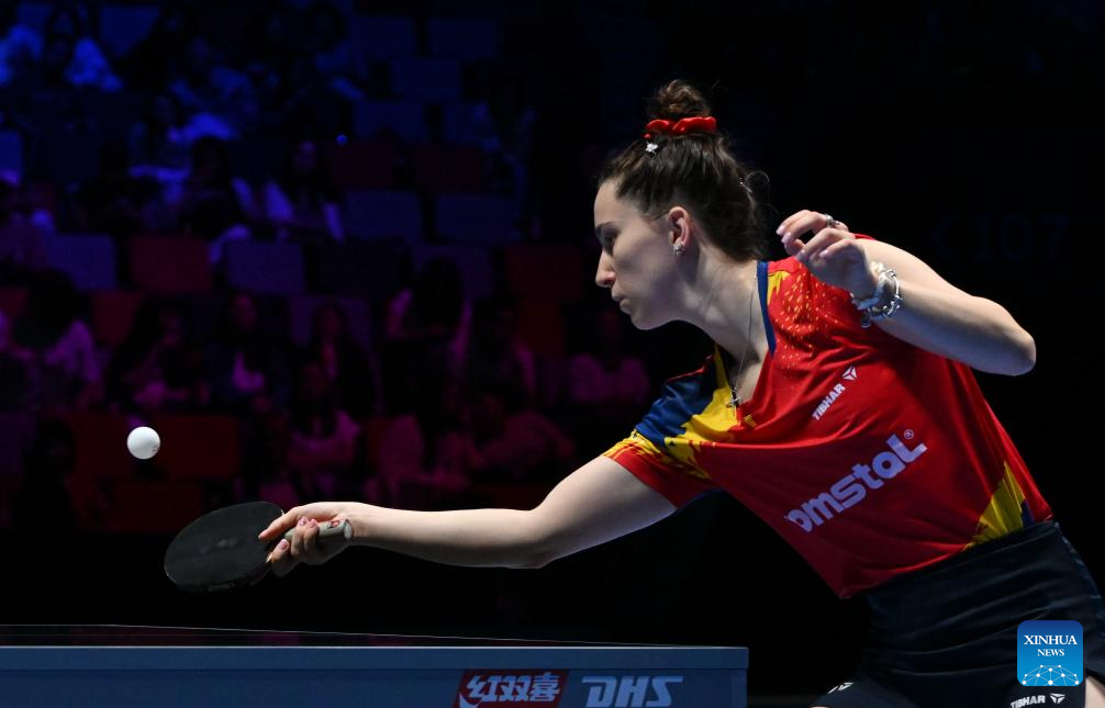 Andreea Dragoman competes during the women's singles group 3 match between Chen Xingtong of China and Andreea Dragoman of Sweden at the ITTF Men's and Women's World Cup 2026 in Macao, China, March 30, 2026. (Xinhua/Yu Yang)