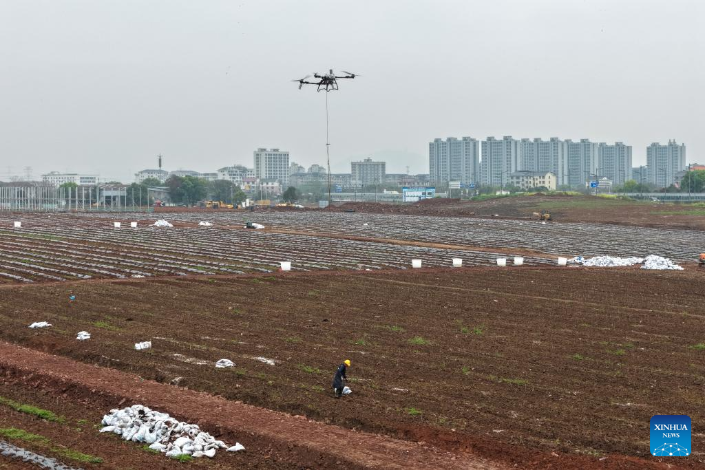 A drone photo taken on March 27, 2026 shows a drone helping a farmer deliver bags of fertilizer in the fields in Jindong District of Jinhua City, east China's Zhejiang Province. (Photo by Shi Kuanbing/Xinhua)