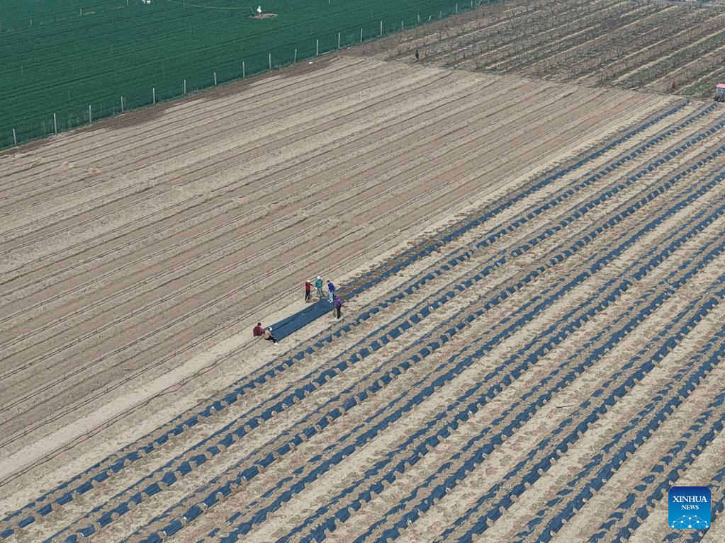 An aerial drone photo taken on March 28, 2026 shows farmers covering the fields with mulch film in Wenxian County, Jiaozuo City, central China's Henan Province. (Photo by Xu Hongxing/Xinhua)