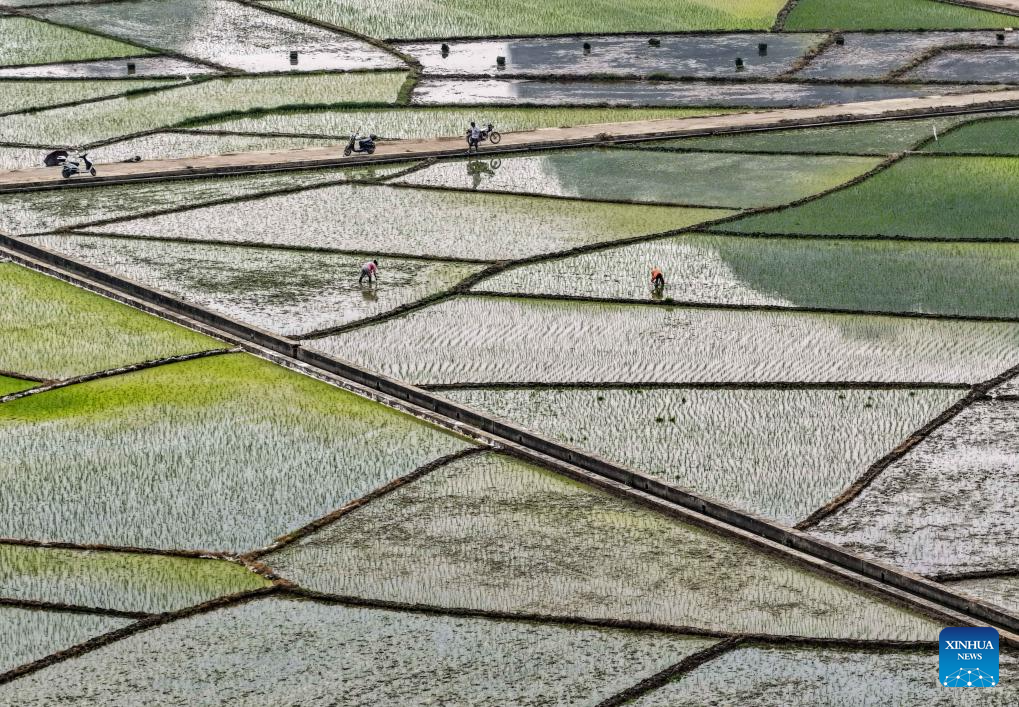 A drone photo taken on March 29, 2026 shows farmers working in fields in Matang Village of Xingye County, Yulin City in south China's Guangxi Zhuang Autonomous Region. (Photo by Liu Zheng/Xinhua)