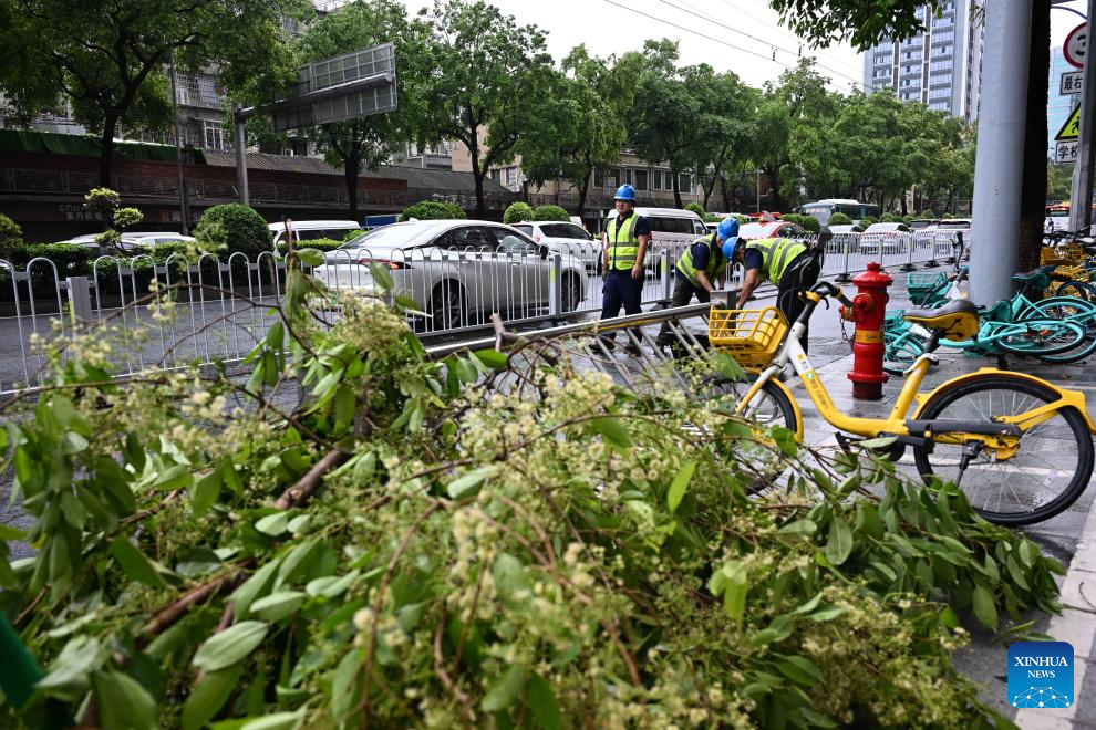 Staff members clear fallen trees from a road in Guangzhou, south China's Guangdong Province, March 30, 2026.