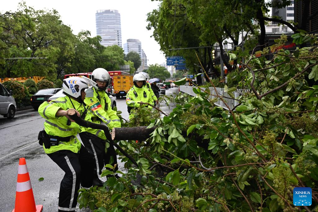 Traffic police clear fallen trees from a road in Guangzhou, south China's Guangdong Province, March 30, 2026.