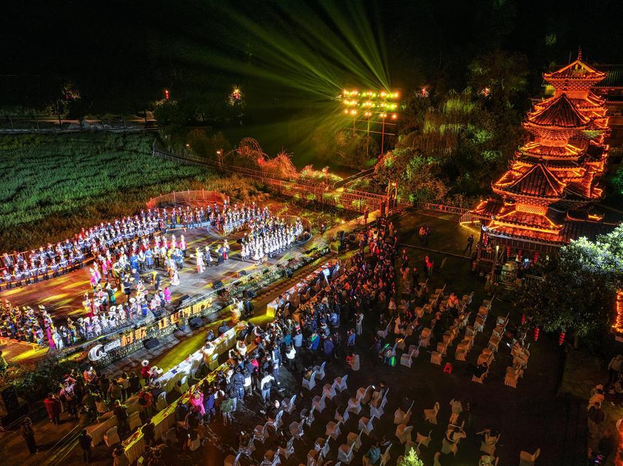 An aerial drone photo taken on March 23, 2026 shows a view of a cultural exchange gala at Zhaoxing Dong Village of Liping County, southwest China's Guizhou Province. (Xinhua/Yang Wenbin)