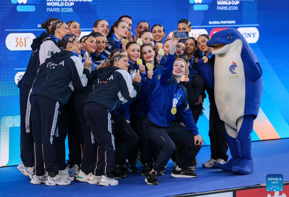 Gold medalists Team Ukraine (C), silver medalists Team Italy (L) and bronze medalists Team Israel take selfies during the awarding ceremony after the team acrobatic final at the World Aquatics Artistic Swimming World Cup 2026 - Stop 2 in Paris, France, March 29, 2026. (Xinhua/Wu Huiwo)