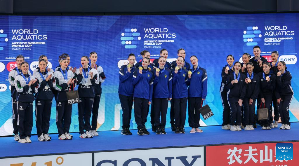 Gold medalists Team Ukraine (C), silver medalists Team Italy (L) and bronze medalists Team Israel pose for photos during the awarding ceremony after the team acrobatic final at the World Aquatics Artistic Swimming World Cup 2026 - Stop 2 in Paris, France, March 29, 2026. (Xinhua/Wu Huiwo)