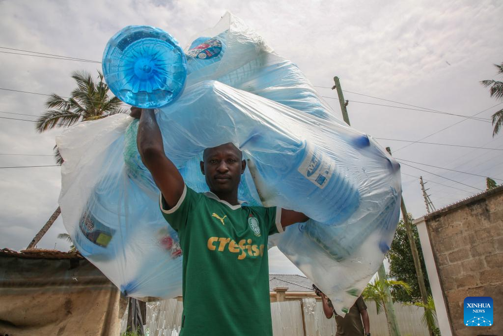 A worker collects a bag of plastic buckets in Dar es Salaam, Tanzania, March 19, 2026. (Xinhua/Emmanuel Herman)