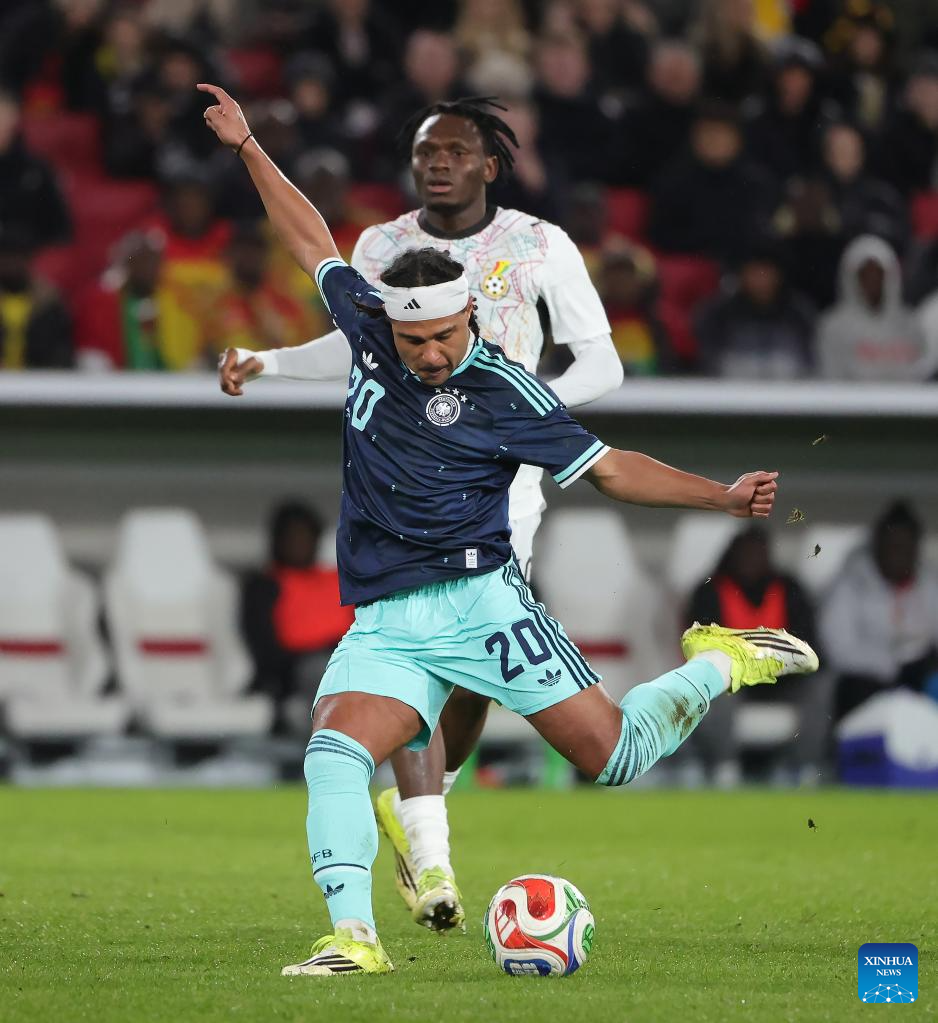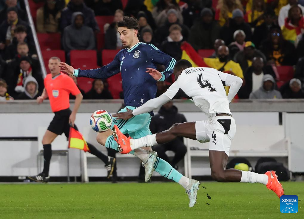 Kai Havertz (L) of Germany vies with Jonas Adjetey of Ghana during an international friendly football match between Germany and Ghana in Stuttgart, Germany, March 30, 2026. (Photo by Philippe Ruiz/Xinhua)