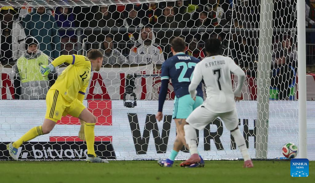 Abdul Fatawu (R) of Ghana scores during an international friendly football match between Germany and Ghana in Stuttgart, Germany, March 30, 2026. (Photo by Philippe Ruiz/Xinhua)
