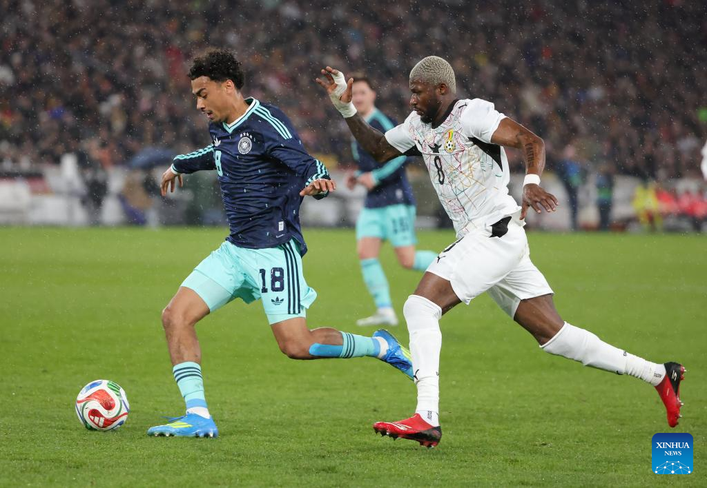 Nathaniel Brown (L) of Germany vies with Kwasi Sibo of Ghana during an international friendly football match between Germany and Ghana in Stuttgart, Germany, March 30, 2026. (Photo by Philippe Ruiz/Xinhua)