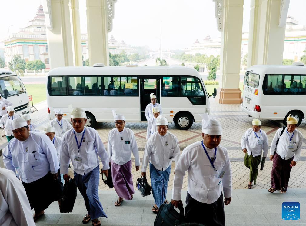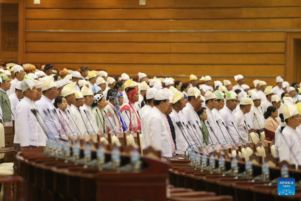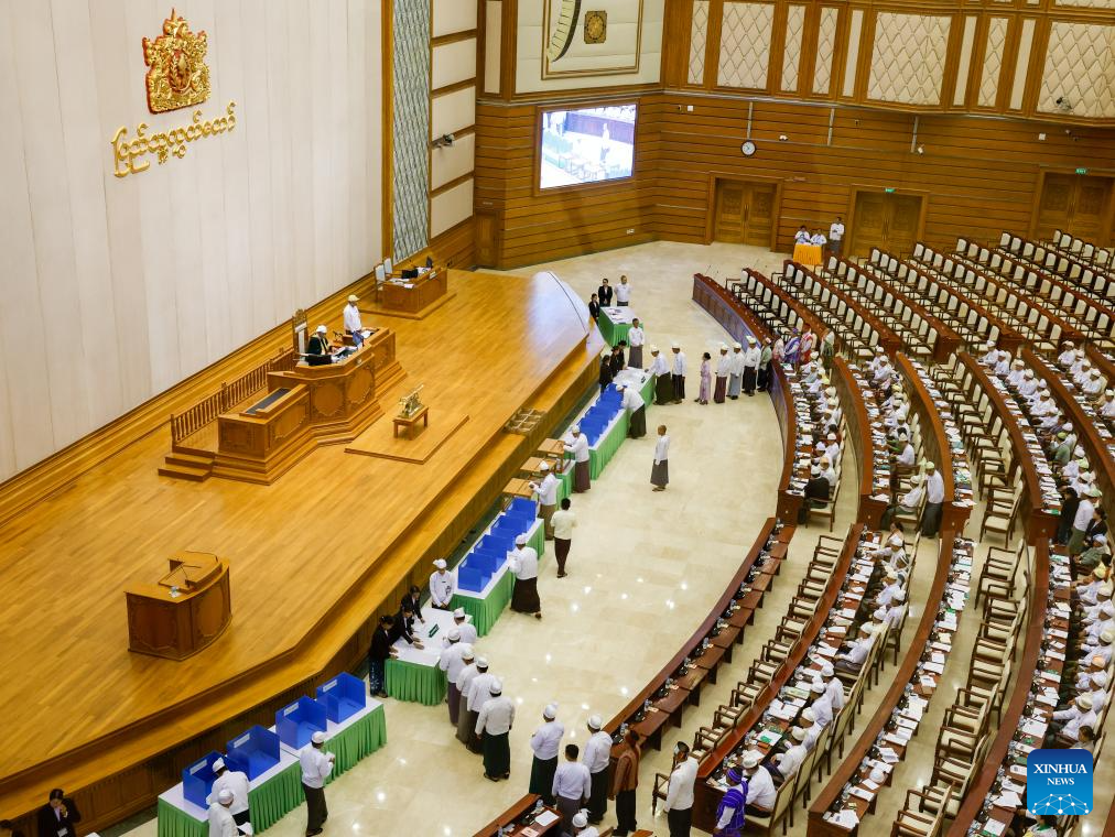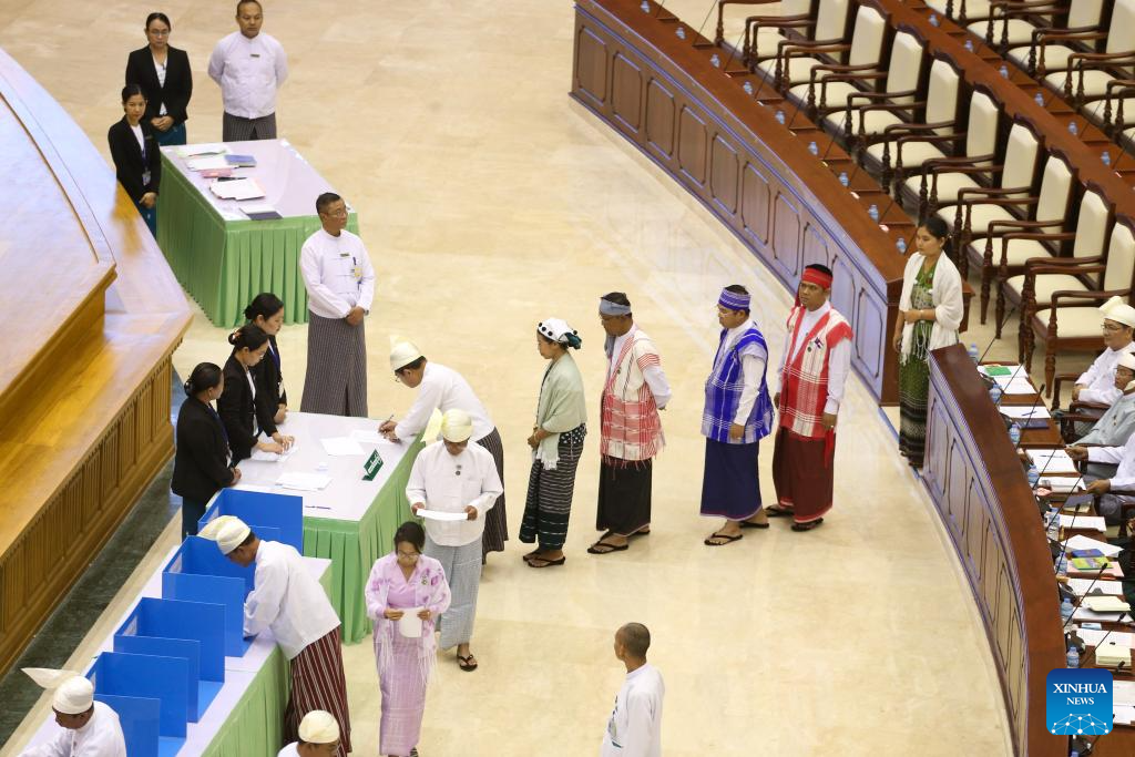 The second day meeting of the elected Pyithu Hluttaw representatives' group is held in Nay Pyi Taw, Myanmar, March 31, 2026. U Nyo Saw was elected vice president by the group of military representatives from both houses of Myanmar's Union Parliament on Tuesday, according to the Information Team of the National Defense and Security Council. Min Aung Hlaing was elected vice president by the Pyithu Hluttaw (Lower House) group with a majority of votes, while Nan Ni Ni Aye was elected by the Amyotha Hluttaw (Upper House) group. The presidential electoral college, composed of all representatives of the Union Parliament, will elect the president from among the three vice presidents. (Xinhua/Myo Kyaw Soe)