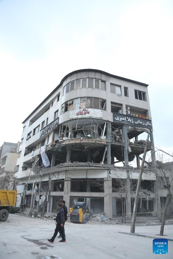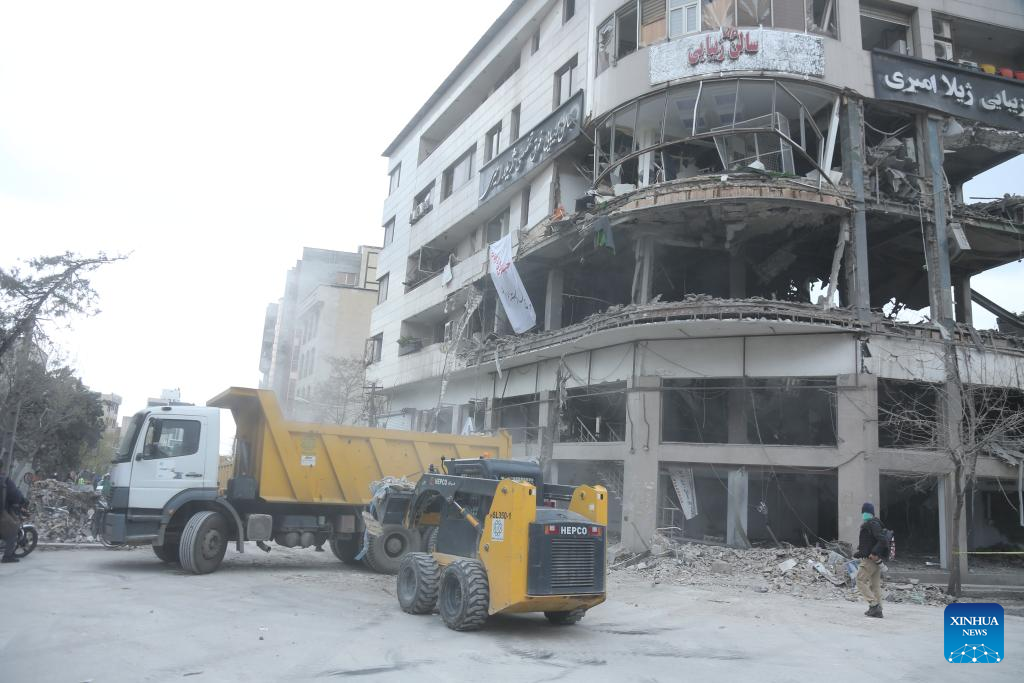 This photo taken on March 29, 2026 shows vehicles removing debris outside the building that houses the offices of the Qatari Al Araby TV after a missile strike in Tehran, Iran. The Qatari Al Araby TV said on Sunday that its offices in Tehran were damaged by Israeli airstrike. (Xinhua/Shadati)
