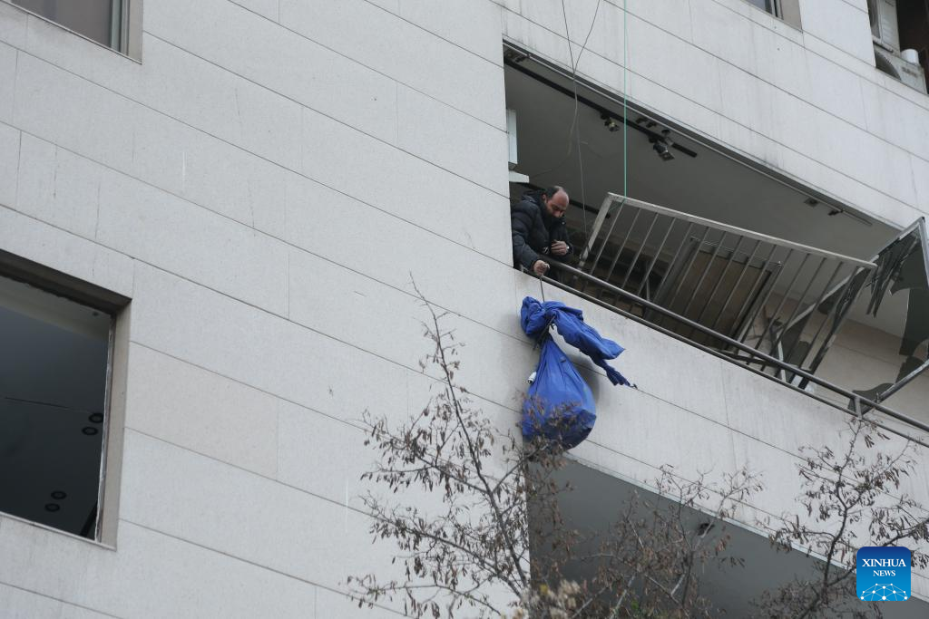 A staff member of the Qatari Al Araby TV transfers equipment from the building that houses the news network's offices after a missile strike in Tehran, Iran, March 29, 2026. The Qatari Al Araby TV said on Sunday that its offices in Tehran were damaged by Israeli airstrike. (Xinhua/Shadati)