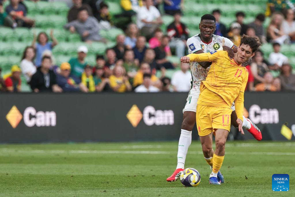 Xu Bin (R) of China competes during the FIFA Series 2026 International Friendly Match between China and Cameroon in Melbourne, Australia, March 31, 2026. (Photo by Jin Cheng/Xinhua)