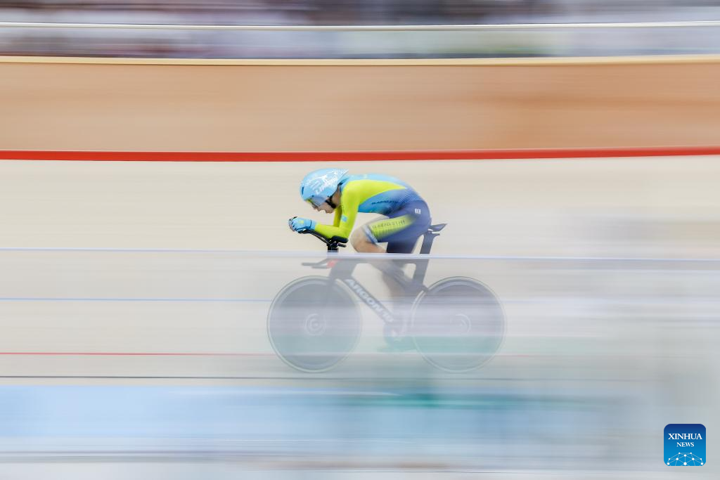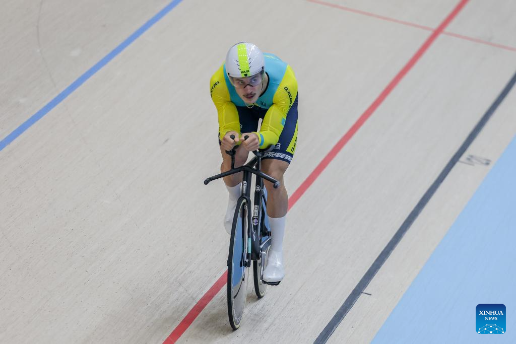 Zeinolla Azamatuly of Kazakhstan competes during the men junior - individual pursuit qualification at the 2026 Asian Track Championships in Tagaytay City, the Philippines, on March 31, 2026. (Xinhua/Rouelle Umali)