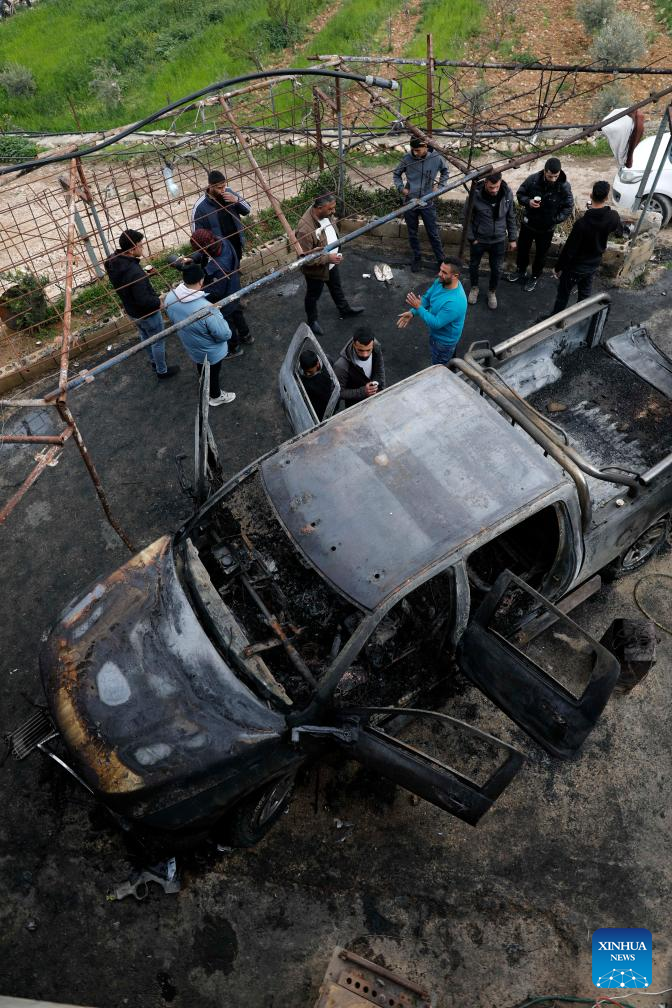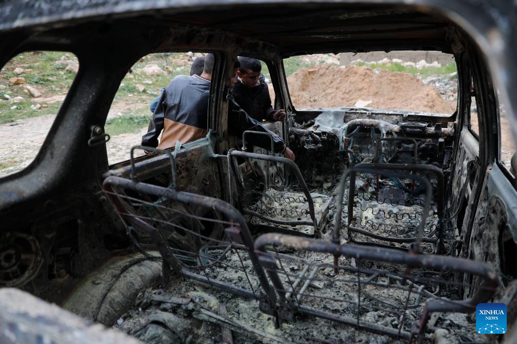 Palestinians inspect a damaged vehicle torched by Israeli settlers, in northeast of Hebron, the southern West Bank, March 30, 2026. (Photo by Mamoun Wazwaz/Xinhua)