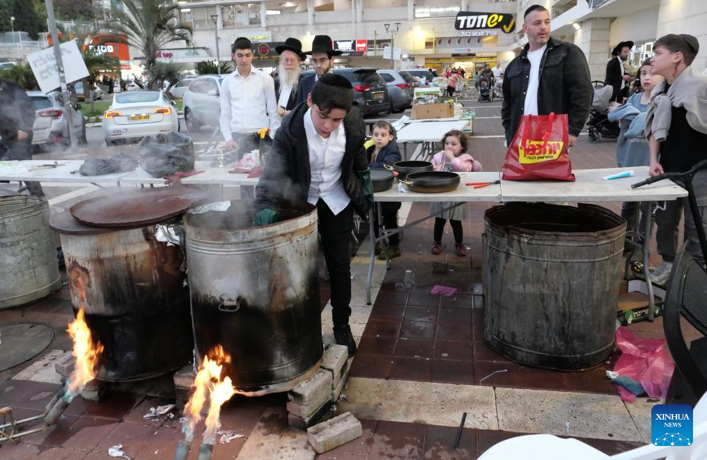 Ultra-Orthodox Jews dip cookware in boiling water to remove remains of leaven during preparations for the Jewish Passover holiday in Modiin, central Israel, March 30, 2026. (Photo by Gil Cohen Magen/Xinhua)