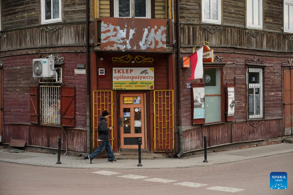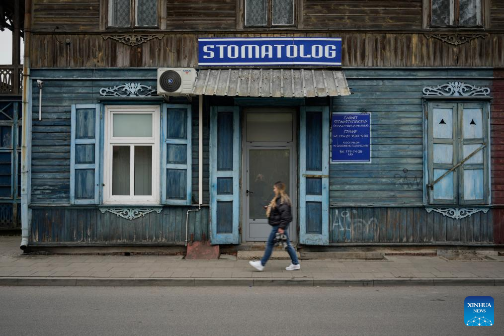 A pedestrian walks past a shop located in a Swidermajer-style wooden building in Otwock, Poland, March 30, 2026.