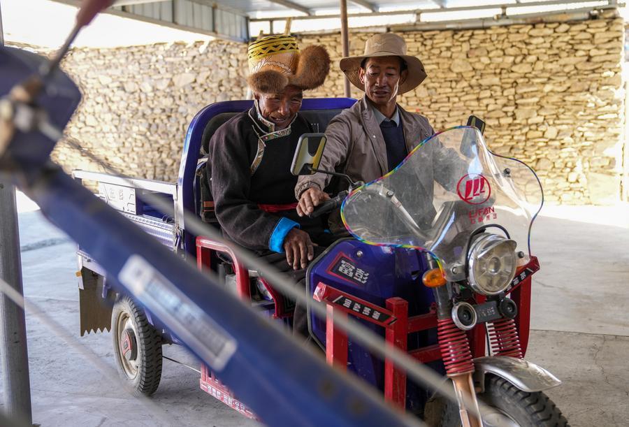 Padma Tashi (L) sits on a new electric tricycle bought by his son-in-law at home in Zhanang County, southwest China's Xizang Autonomous Region, March 26, 2026. (Xinhua/Jigme Dorje)