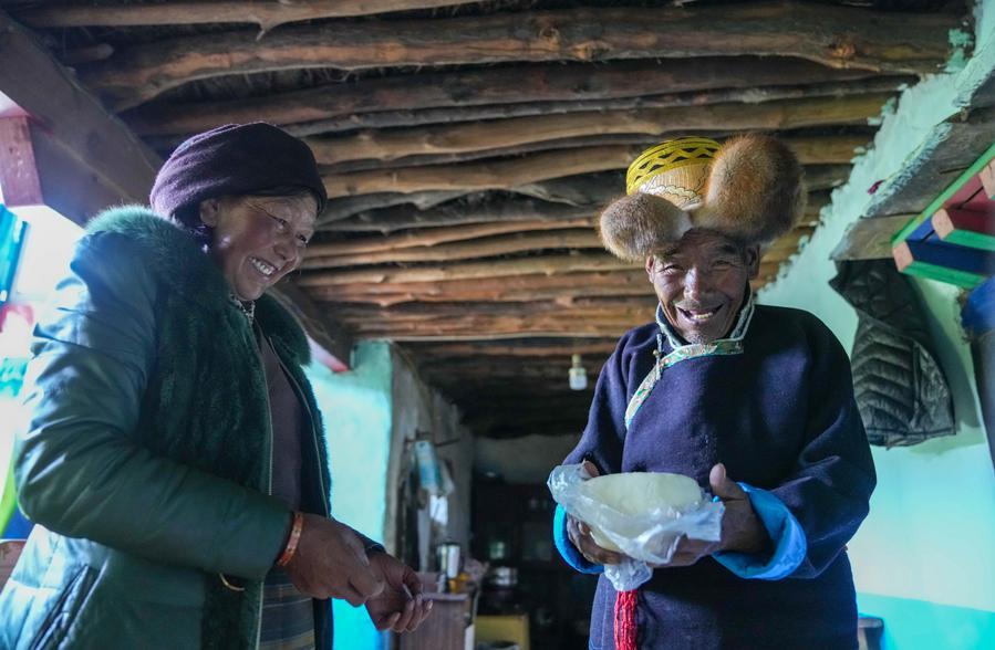 Padma Tashi (R) hands a piece of butter used to make tea at home in Zhanang County, southwest China's Xizang Autonomous Region, March 26, 2026. (Xinhua/Jigme Dorje)