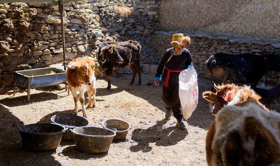 Padma Tashi feeds cows at home in Zhanang County, southwest China's Xizang Autonomous Region, March 26, 2026. (Xinhua/Tenzin Nyida)