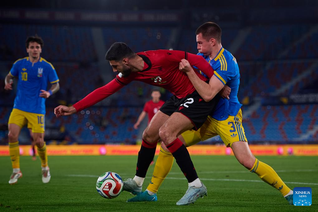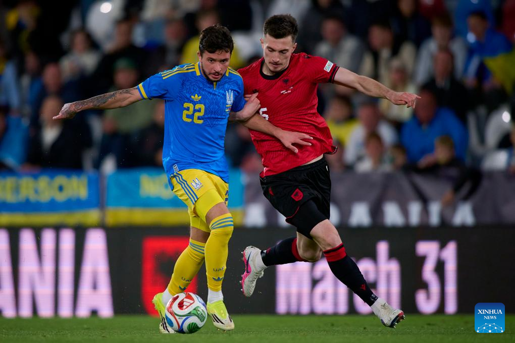 Bogdan Mykhaylichenko (R) of Ukraine vies with Armando Borja (C) of Albania during an international friendly football match between Ukraine and Albania in Valencia, Spain, March 31, 2026. (Xinhua)