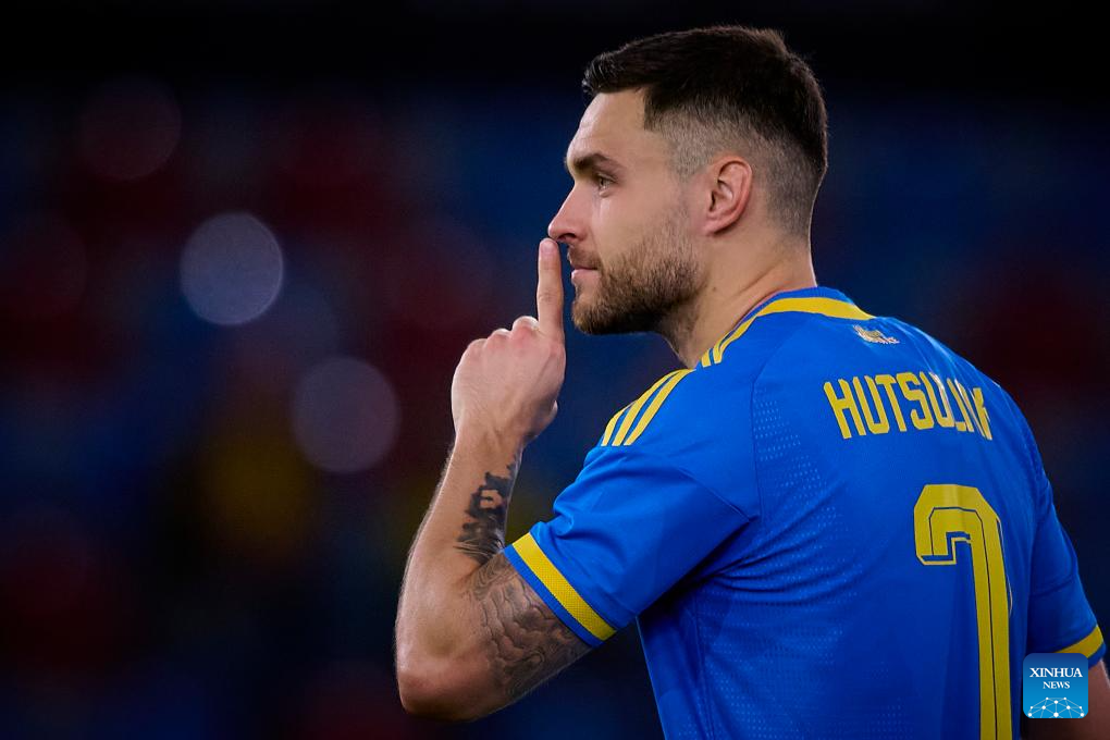 Oleksiy Hutsulyak of Ukraine celebrates his goal during an international friendly football match between Ukraine and Albania in Valencia, Spain, March 31, 2026. (Xinhua)