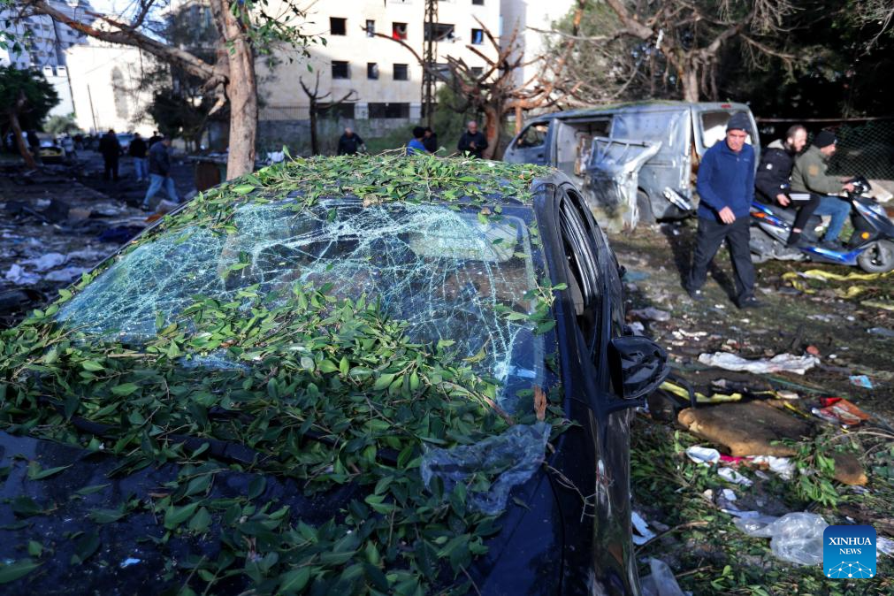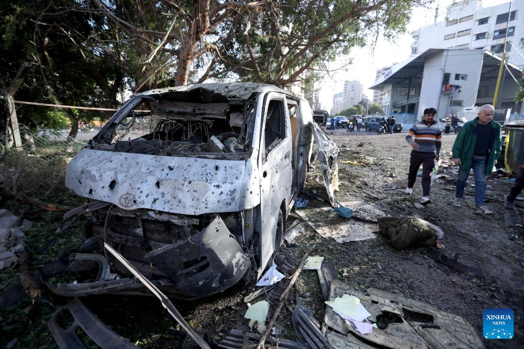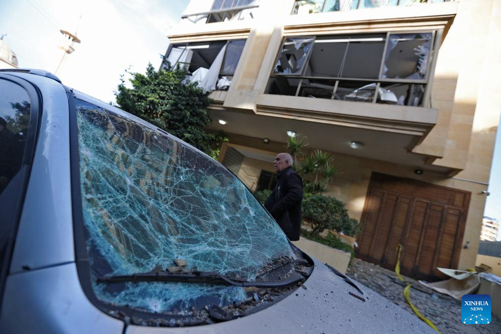 This photo taken on April 1, 2026 shows the building and vehicle damaged in Israeli strikes in the Jnah area of Beirut, Lebanon. An Israeli naval strike targeted a convoy of vehicles in the Jnah area of Beirut on Tuesday night, setting several cars on fire and causing loud explosions heard across the capital and its suburbs, Lebanon's National News Agency (NNA) reported. (Photo by Bilal Jawich/Xinhua)