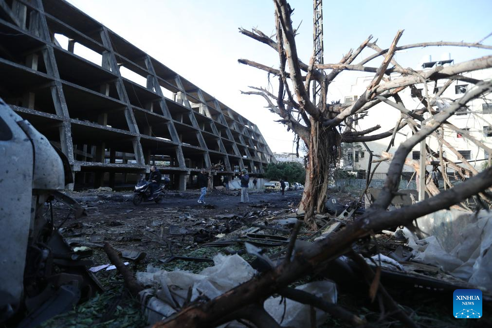 This photo taken on April 1, 2026 shows buildings and vehicles destroyed in Israeli strikes in the Jnah area of Beirut, Lebanon. An Israeli naval strike targeted a convoy of vehicles in the Jnah area of Beirut on Tuesday night, setting several cars on fire and causing loud explosions heard across the capital and its suburbs, Lebanon's National News Agency (NNA) reported. (Photo by Bilal Jawich/Xinhua)