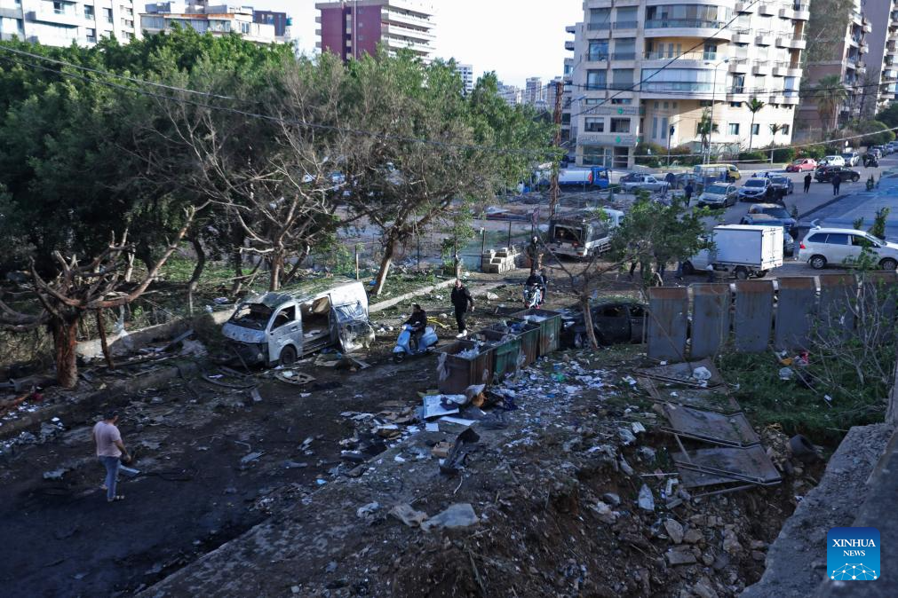 This photo taken on April 1, 2026 shows the destruction on a street after Israeli strikes in the Jnah area of Beirut, Lebanon. An Israeli naval strike targeted a convoy of vehicles in the Jnah area of Beirut on Tuesday night, setting several cars on fire and causing loud explosions heard across the capital and its suburbs, Lebanon's National News Agency (NNA) reported. (Photo by Bilal Jawich/Xinhua)