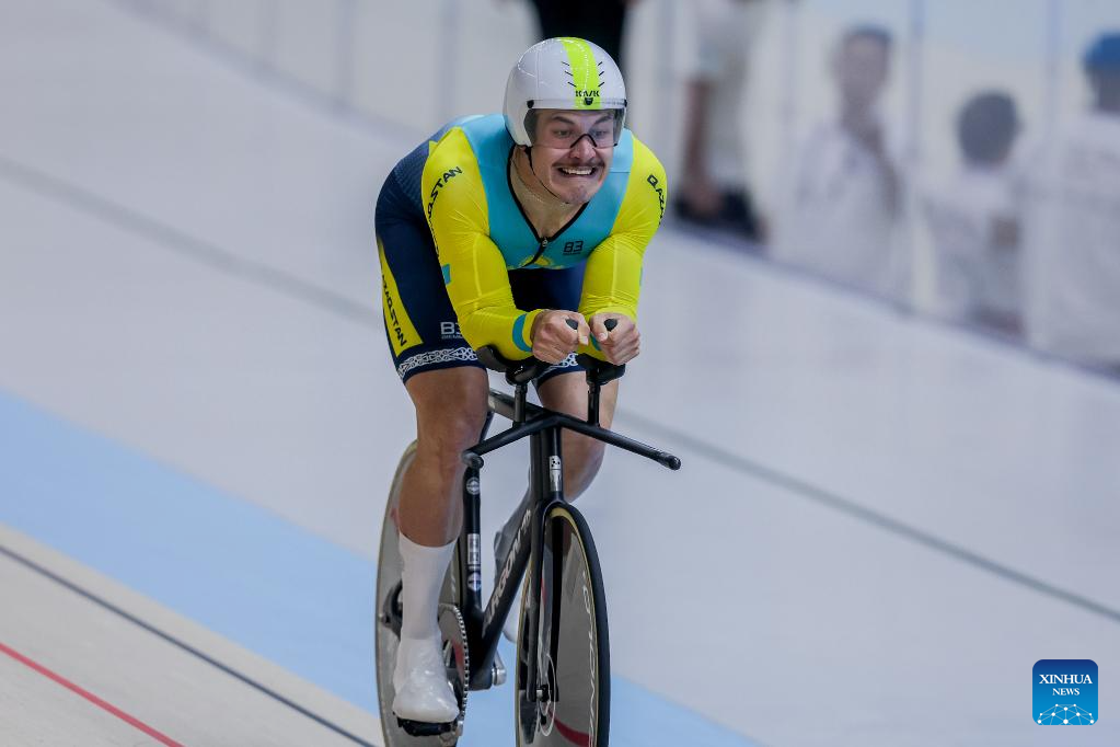 Kirill Kurdidi of Kazakhstan competes during the men elite - 1km time trial final at the 2026 Asian Track Championships in Tagaytay City, the Philippines, on March 31, 2026. (Xinhua/Rouelle Umali)