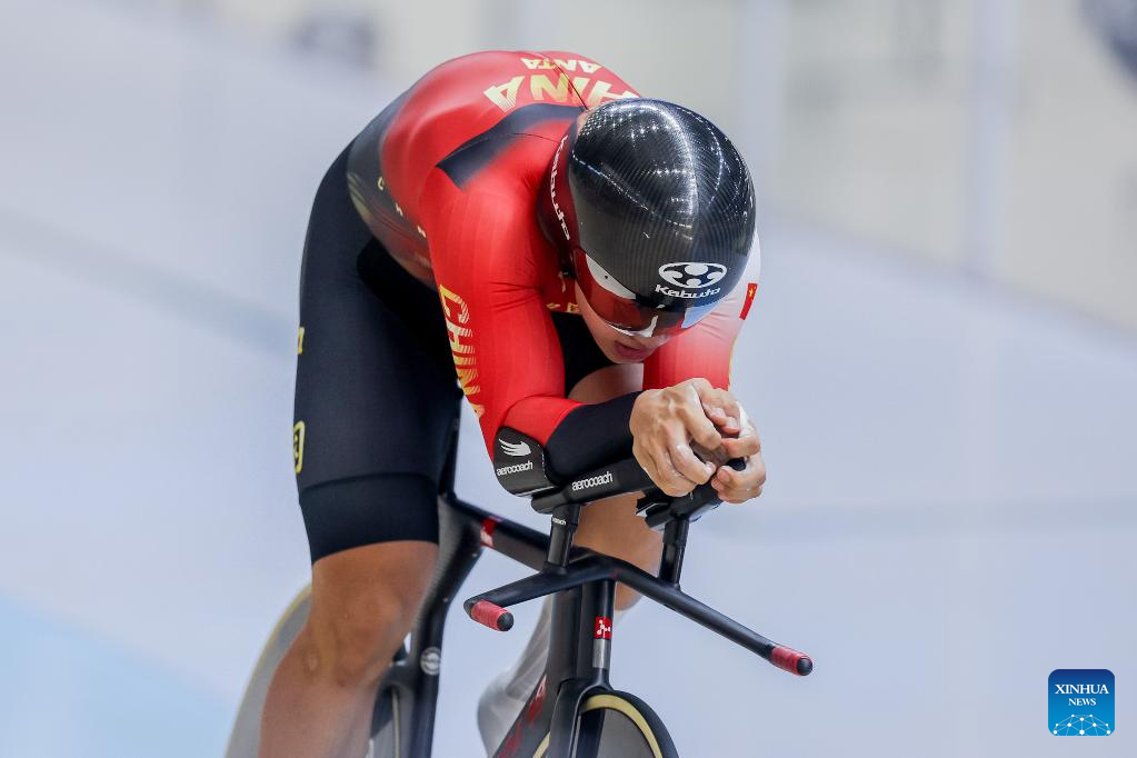 Xie Han of China competes during the men elite - 1km time trial final at the 2026 Asian Track Championships in Tagaytay City, the Philippines, on March 31, 2026. (Xinhua/Rouelle Umali)