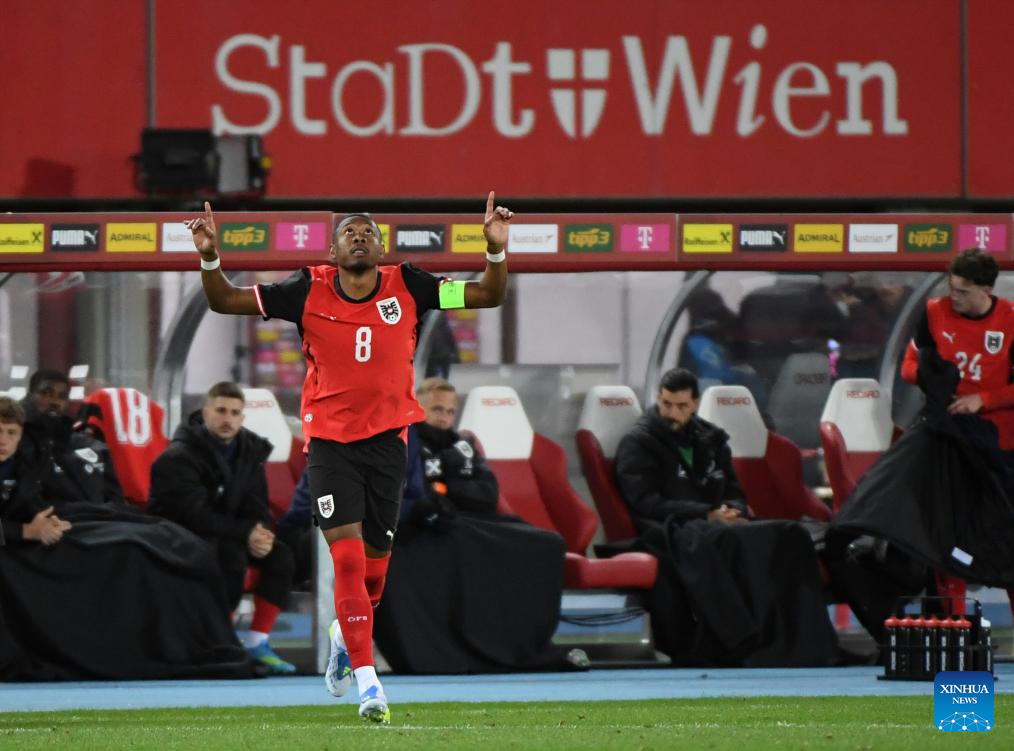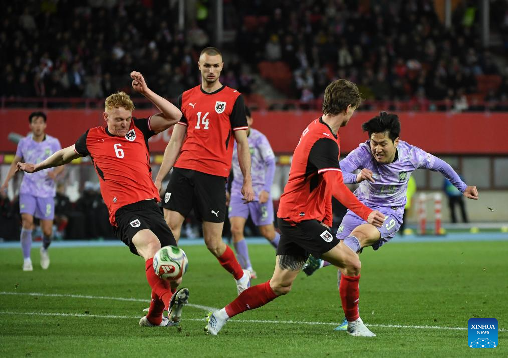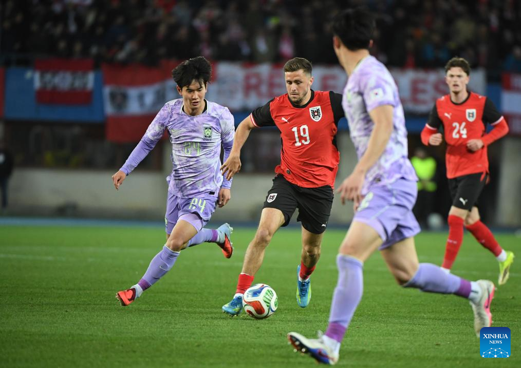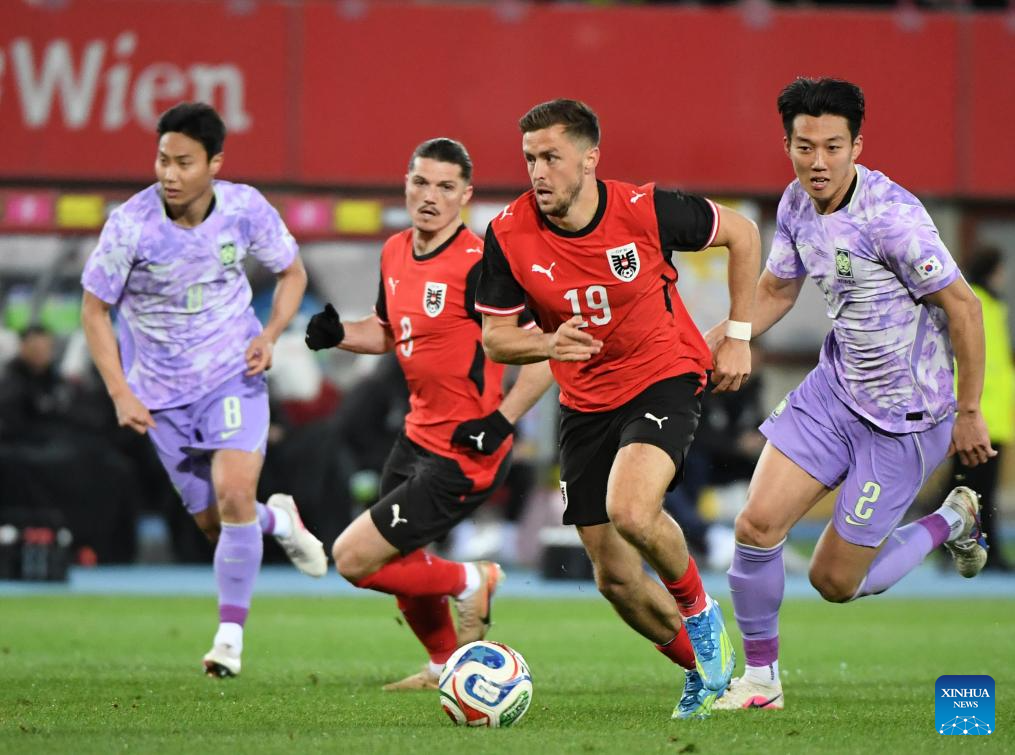 Christoph Baumgartner (2nd R) of Austria competes during a friendly match between Austria and South Korea in Vienna, Austria, on March 31, 2026. (Xinhua/He Canling)