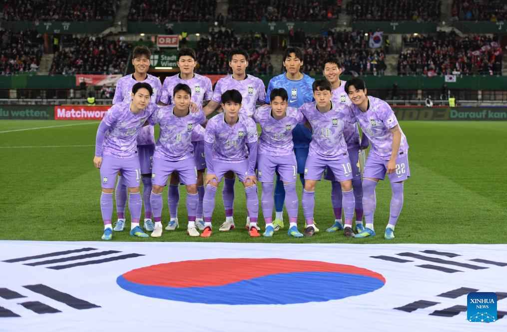 Players of South Korea pose for a group photo before a friendly match between Austria and South Korea in Vienna, Austria, on March 31, 2026. (Xinhua/He Canling)