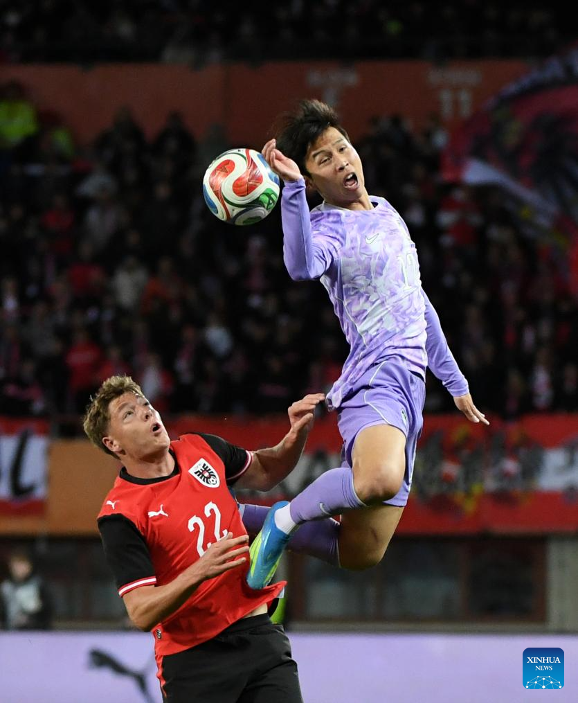 Eom Ji Sung (R) of South Korea heads the ball during a friendly match between Austria and South Korea in Vienna, Austria, on March 31, 2026. (Xinhua/He Canling)
