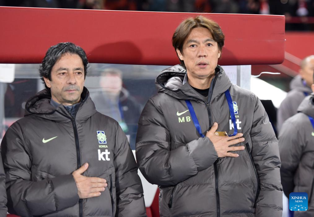South Korea's head coach Hong Myung-bo (R) reacts before a friendly match between Austria and South Korea in Vienna, Austria, on March 31, 2026. (Xinhua/He Canling)
