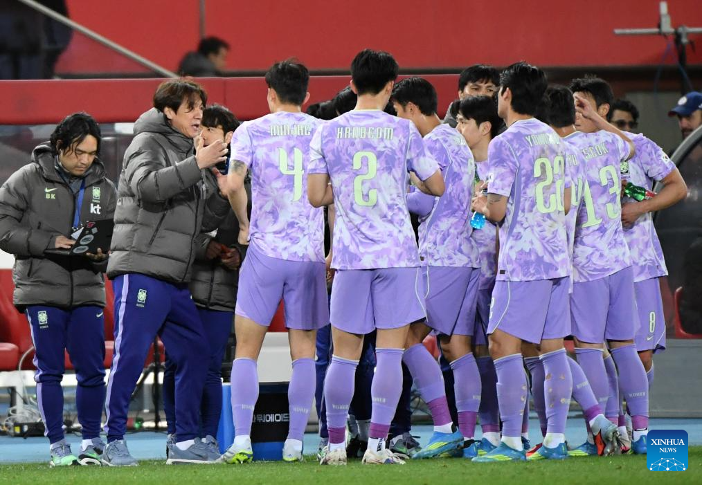 South Korea's head coach Hong Myung-bo (2nd L) instructs players during a friendly match between Austria and South Korea in Vienna, Austria, on March 31, 2026. (Xinhua/He Canling)