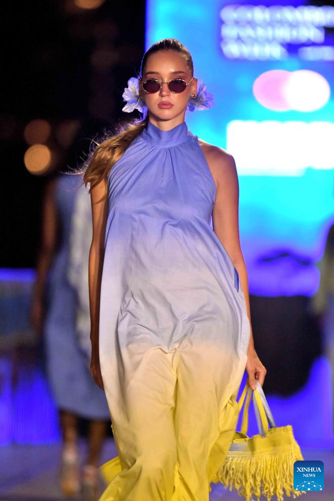 A model presents a creation during the Colombo Fashion Week in Colombo, Sri Lanka on April 1, 2026. The Colombo Fashion Week Summer 2026 takes place from April 1 to 4. The four-day event showcases creations from more than 30 designers. (Photo by Ajith Perera/Xinhua)