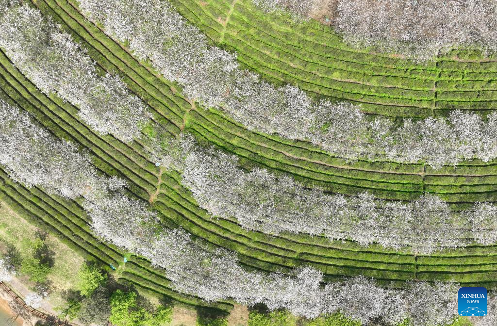 An aerial drone photo taken on April 1, 2026 shows the scenery of cherry blossoms in Nanchang County of east China's Jiangxi Province. (Xinhua/Wan Xiang)