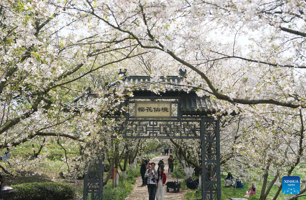 People enjoy the scenery of cherry blossoms in Nanchang County of east China's Jiangxi Province, April 1, 2026. (Xinhua/Wan Xiang)
