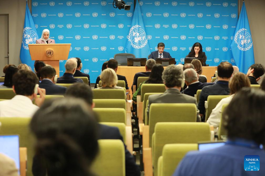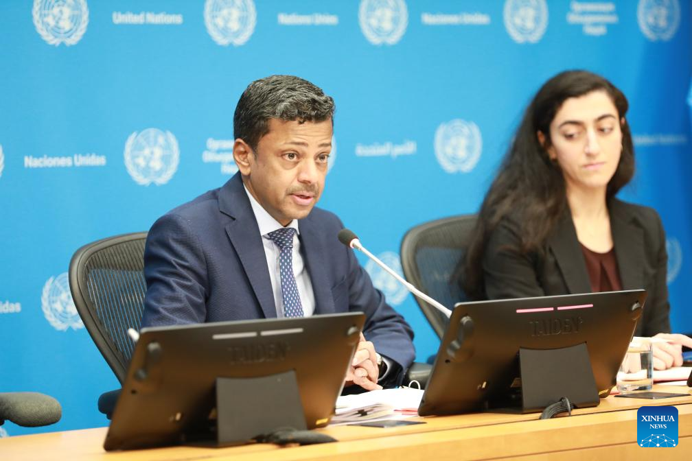 Jamal Fares Alrowaiei (L), Bahrain's permanent representative to the United Nations, holds a press briefing at the UN headquarters in New York, on April 1, 2026. The UN Security Council will focus on the Middle East in April, taking up issues concerning Iran, Lebanon, Gaza and the West Bank, Alrowaiei, also president of the council for the month, said Wednesday. (Xinhua/Xie E)