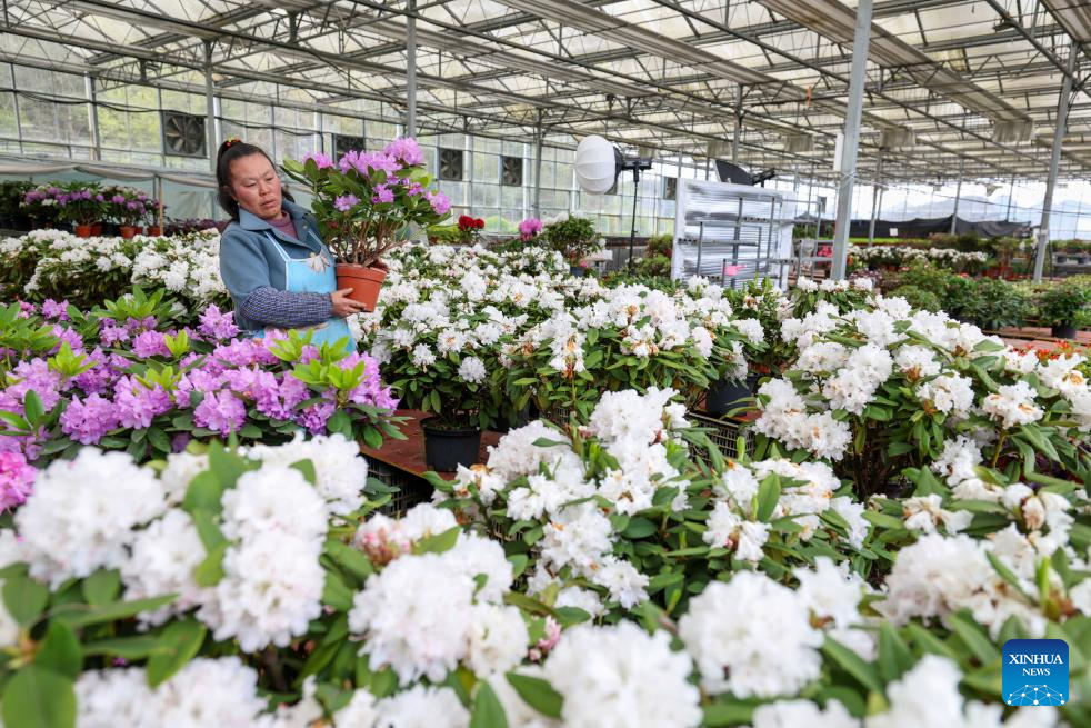 A worker carries cultivated azaleas at a flower science and technology park in Bijie City, southwest China's Guizhou Province, March 28, 2026. The azaleas in Bijie are currently in full bloom, drawing crowds of visitors. (Photo by Han Xianpu/Xinhua)