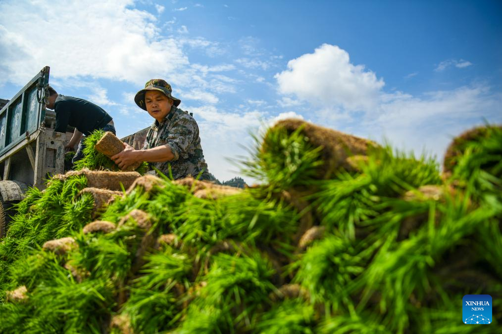 Farmers transport rice seedlings in Jingxing Village in Changning City, central China's Hunan Province, April 1, 2026. (Photo by Zhou Xiuyuchun/Xinhua)