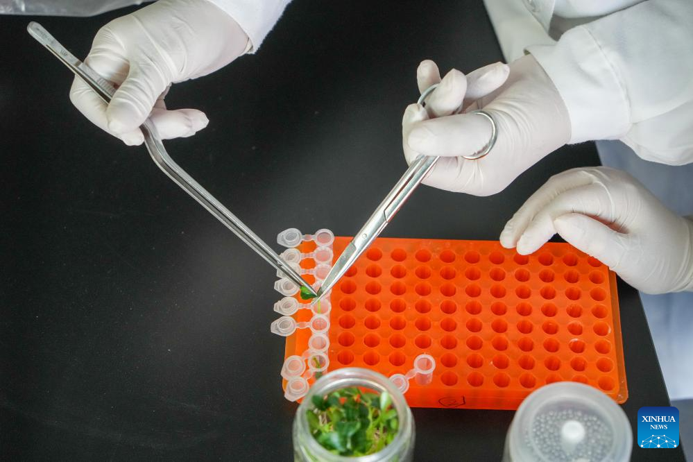 Staff members work at a breeding laboratory at Shouguang vegetable germplasm resource center in Shouguang, east China's Shandong Province, April 1, 2026. Shouguang germplasm resource center, the largest of its kind in Shandong, has collected more than 26,000 vegetable seed species. Seeds here could stay alive for three to five decades in proper storage conditions supported by intelligent and automated control system, which provides crucial foundation for ensuring the security of the national vegetable seed industry and biodiversity. (Xinhua/Xu Suhui)