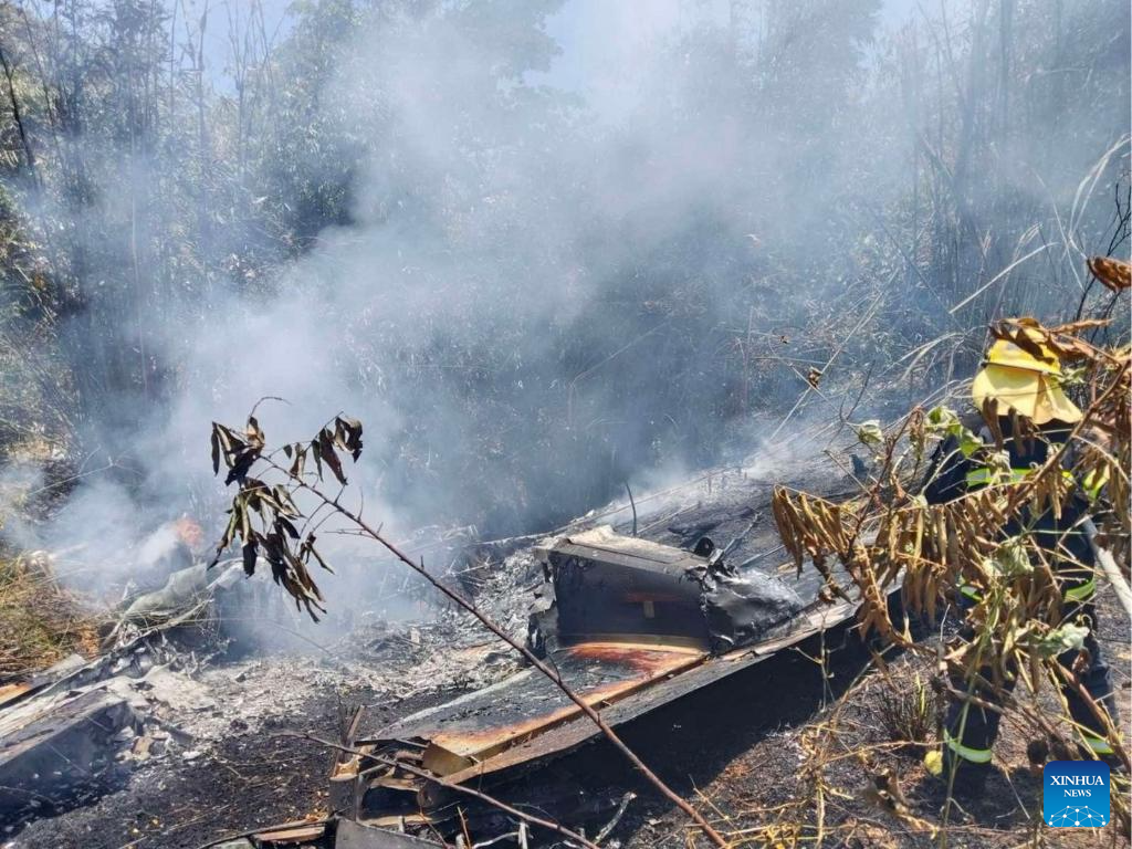 This photo taken on April 2, 2026 shows a scene at the site of an air cargo plane crash in Palawan, the Philippines. Two pilots were killed on Thursday when their air cargo plane crashed outside the perimeter of an airport in Barangay Decalacho in Coron, Palawan, in the Philippines, according to the Philippine National Police Aviation Security Group (PNP-ASG). (Philippine National Police Aviation Security Group/Handout via Xinhua)