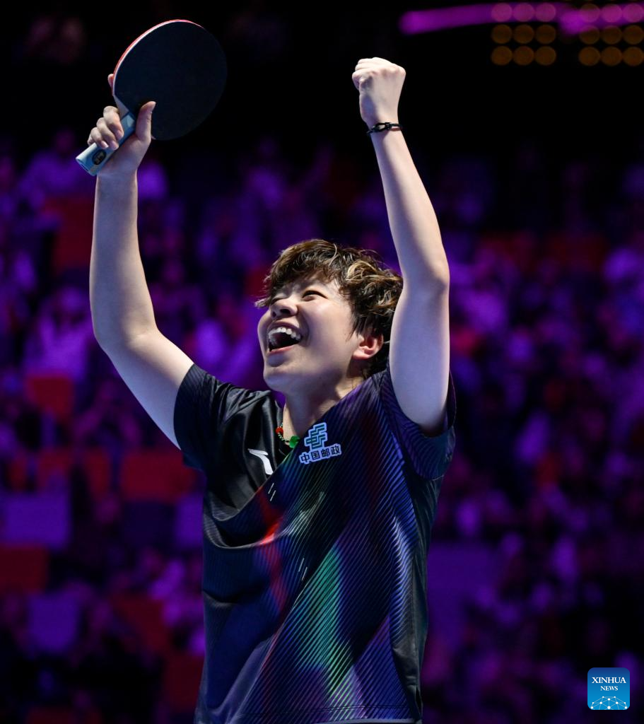Wang Yidi celebrates after the women's singles round of 16 match between Wang Yidi of China and Harimoto Miwa of Japan at the ITTF Men's and Women's World Cup 2026 in Macao, China, April 2, 2026. (Xinhua/Yu Yang)
