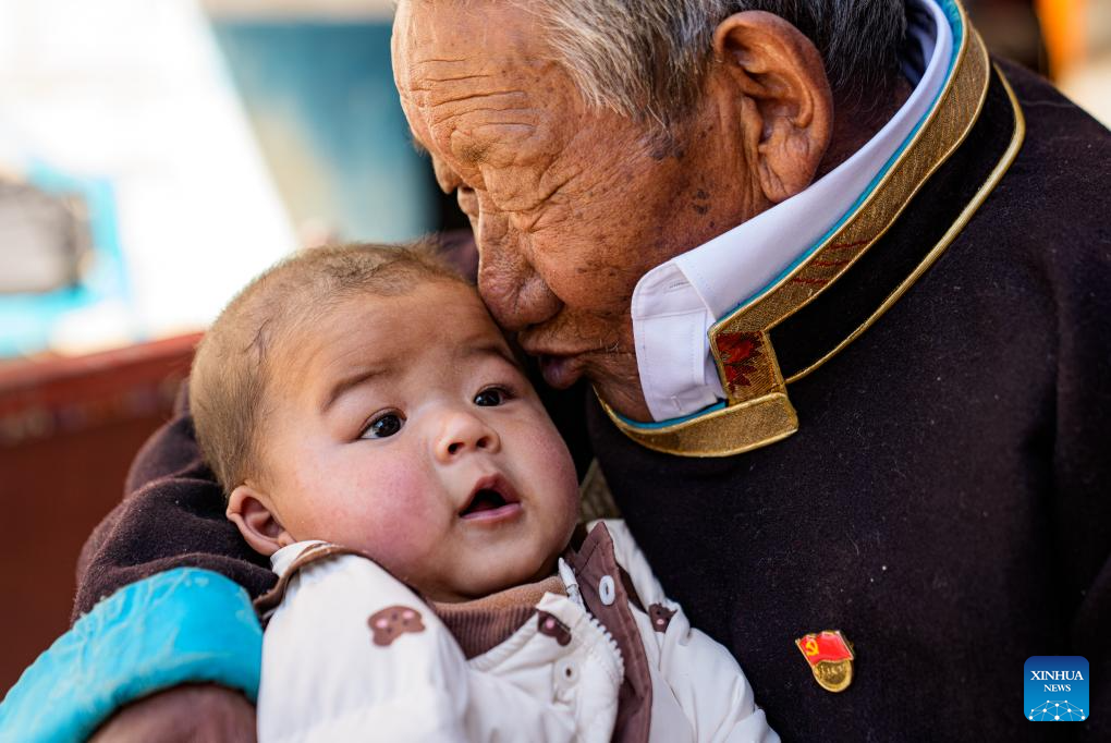 Tsering Samdrup kisses his great-grandson at home in Samyai Town of Shannan, southwest China's Xizang Autonomous Region, March 25, 2026.