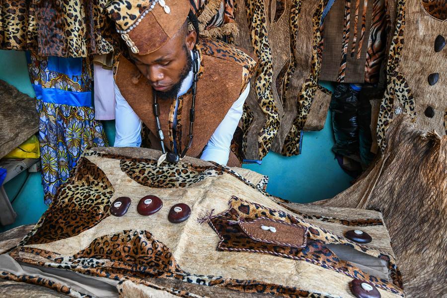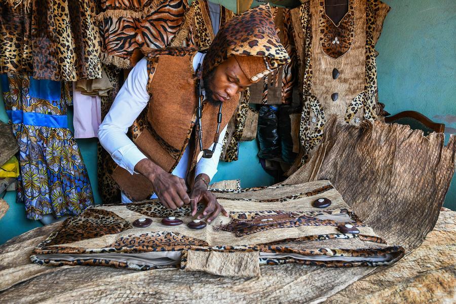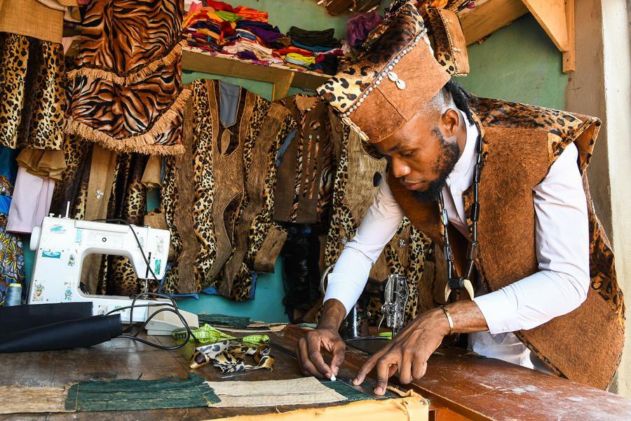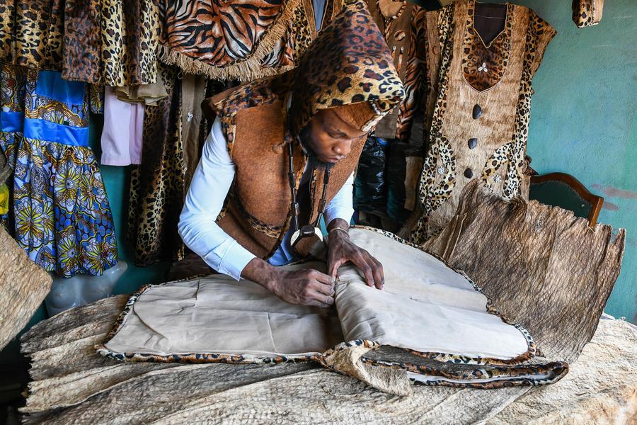 Raphael Nomo Etoga decorates clothing made from traditional Obom fabric at his workshop in Yaounde, Cameroon, March 18, 2026. (Photo by Kepseu/Xinhua)