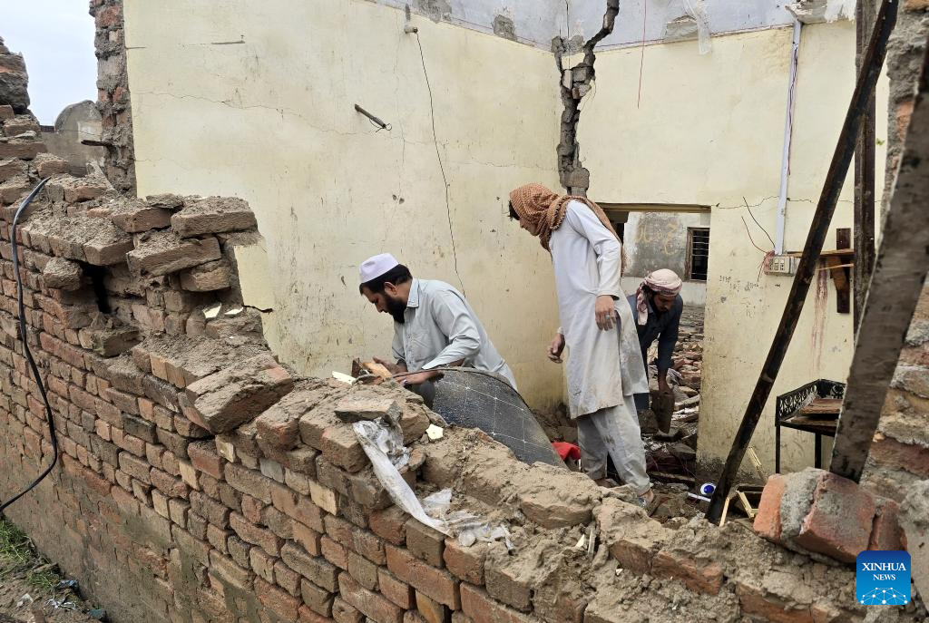 People check a building damaged in a blast in Bannu district of Pakistan's northwestern Khyber Pakhtunkhwa province, April 3, 2026. At least five civilians were killed and several others, including two police personnel, were injured in a blast near a police station in Pakistan's northwestern Khyber Pakhtunkhwa province on Thursday night, police said. The explosion occurred at about 10:40 p.m. local time when an explosive-laden vehicle rammed into the rear wall of a police station in Bannu district, local police sources told Xinhua. The powerful blast caused the wall of the police station to collapse and shattered windows inside the building, the sources said. (Str/Xinhua)